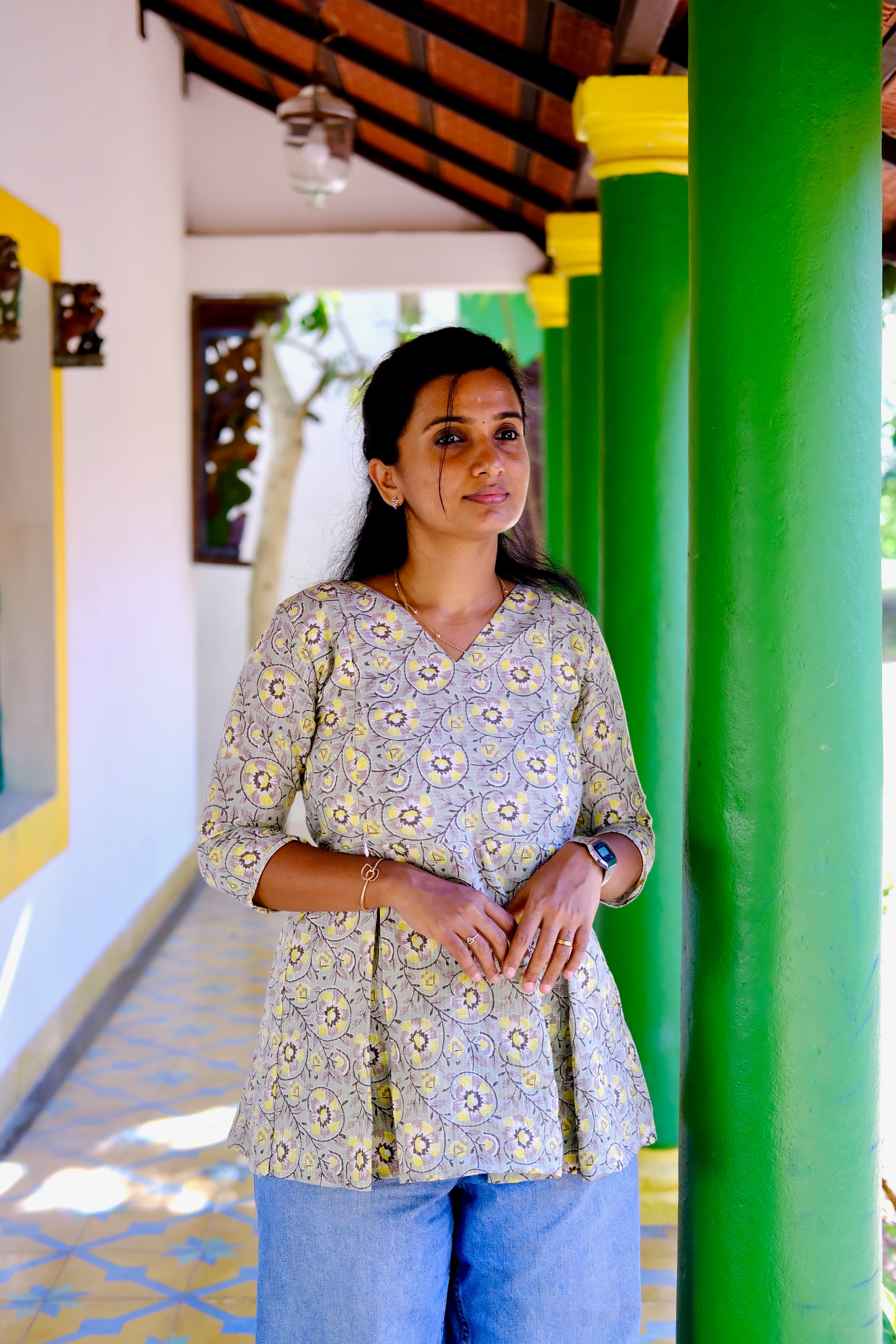 . A box pleat Peplum top. Adorned with vibrant floral prints, it's perfect for summer and complements all body shapes. Designed for comfort, it's also ideal for expectant mothers. Pair it with our Dark Grey Bliss Fit Treggings for a stylish and cozy ensemble, available together for added convenience.