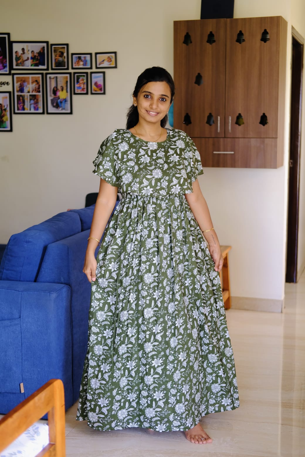 This two-piece set is thoughtfully designed to bring together elegance and functionality. The maxi comes with short sleeves, made from premium breathable cotton that ensures all-day comfort. The yoke part is lined by default, giving it a structured finish, while waist ties and side pockets add both style and practicality. For nursing mothers, the outfit offers a customizable feeding zip option, making it convenient and comfortable during the nursing period.