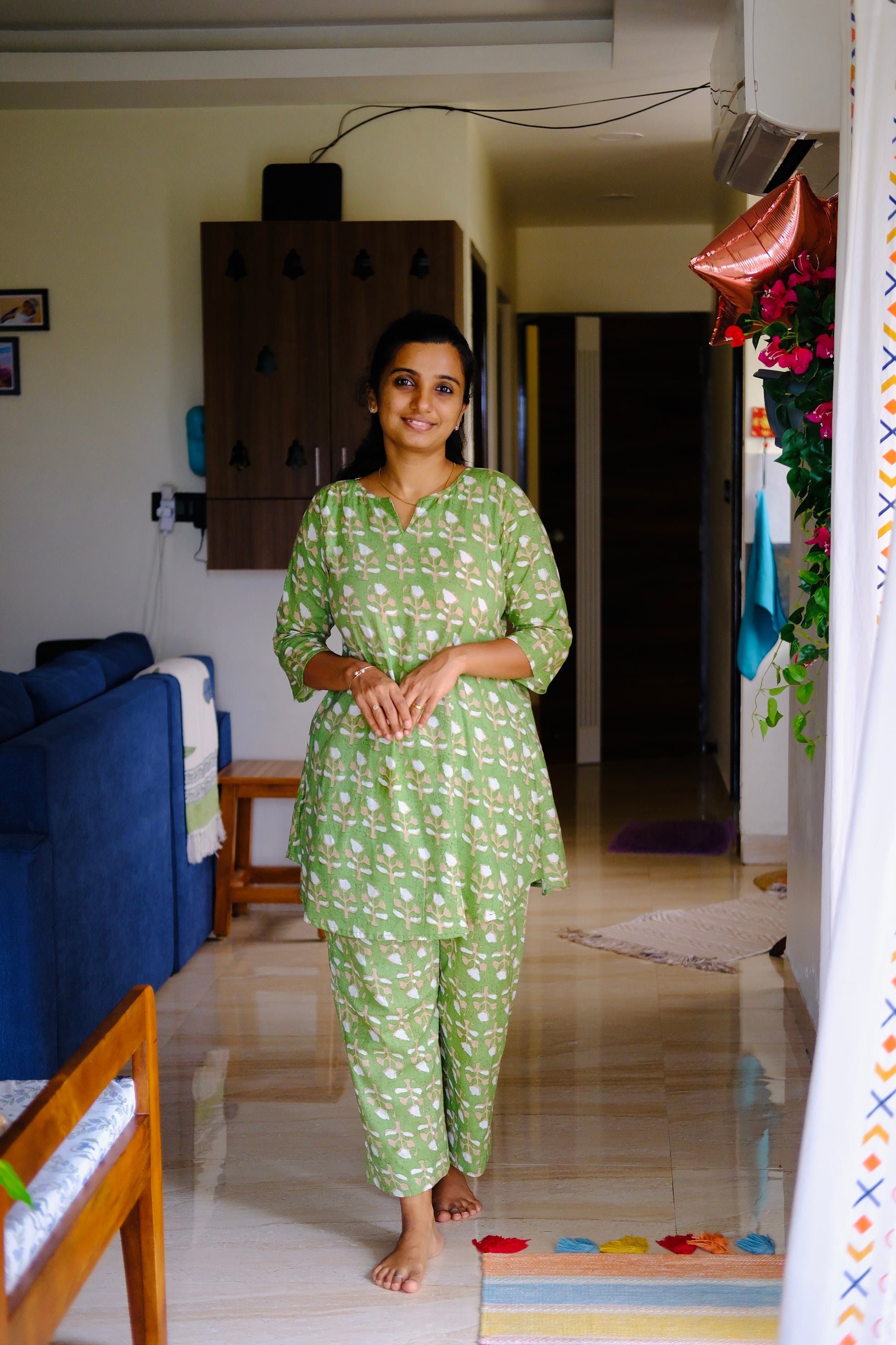 Heera is your everyday companion for comfort and ease — a soft, breathable cotton loungewear set crafted for full coverage. It features a no-slit high-neck top with 3/4th sleeves and relaxed-fit palazzo pants that come with convenient pockets. Thoughtfully stitched with extra seams to allow easy size adjustments later, Heera is perfect for those who prefer modest, functional wear over typical nighties or short tops.
