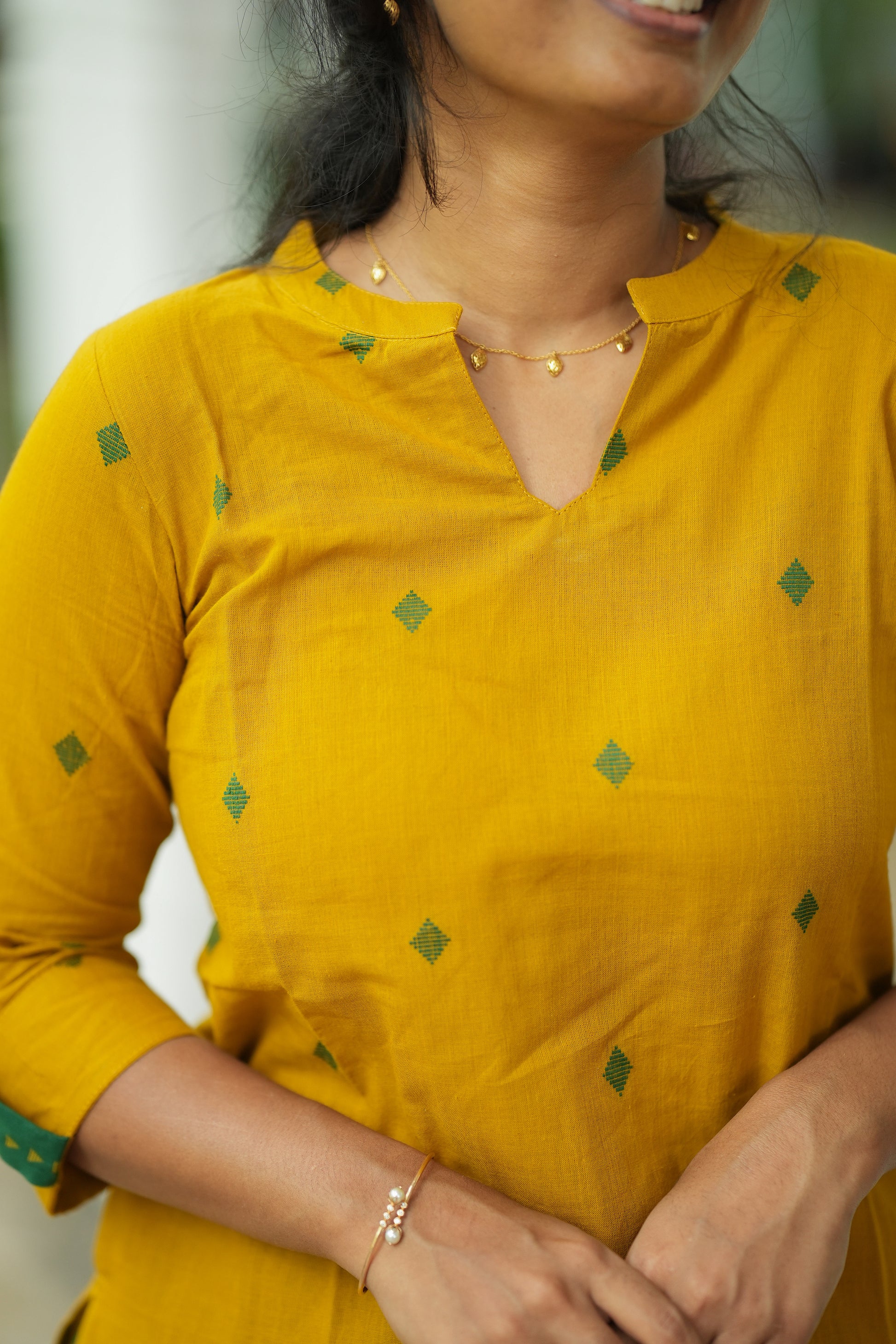 This mathura yellow and green coord set is crafted from breathable handloom cotton, offering natural comfort and timeless appeal. Designed for everyday elegance, the set features a beautifully tailored kurta paired with matching bottoms, creating a coordinated and polished look. The collar neck adds a structured, contemporary touch, while the sleeve highlights in contrasting green enhance the overall design with subtle detailing. The soothing color combination reflects a perfect balance of vibrancy and tradition