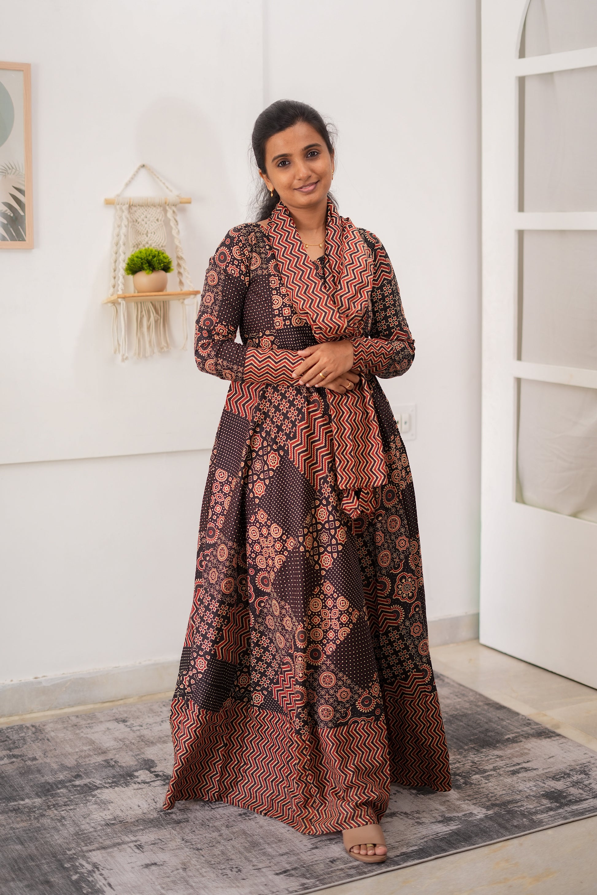 This cotton circular maxi features a rich Ajrakh-inspired geometric print with detailed pattern placement for a traditional look. Designed with full sleeves and a flowy full maxi silhouette for comfortable wear. Comes with a matching stole for styling, perfect for everyday and festive use.
